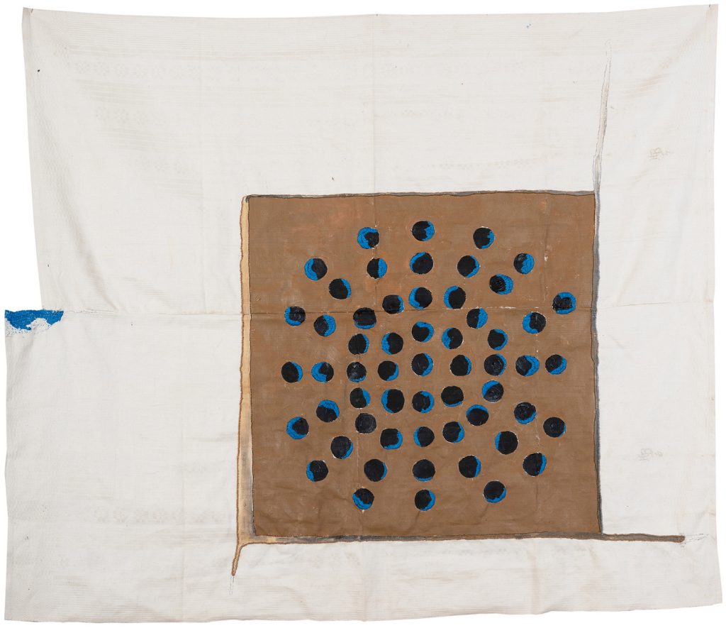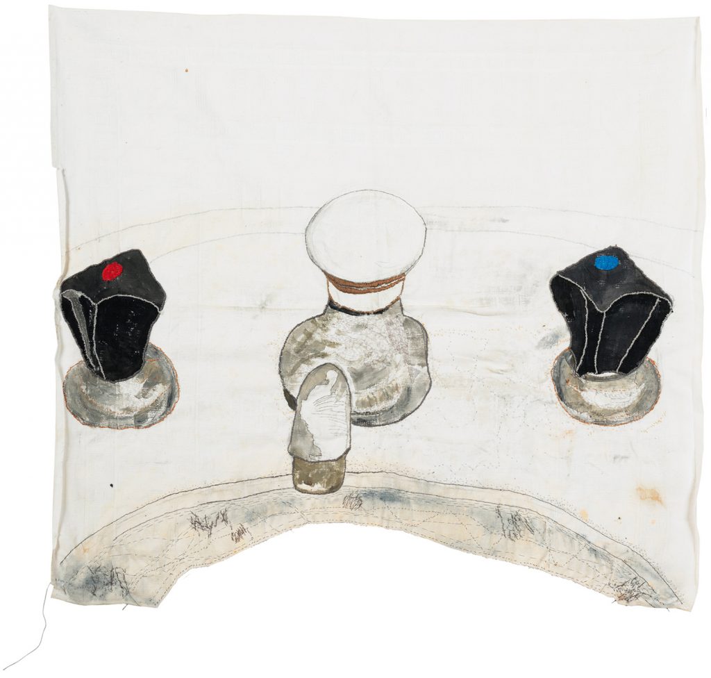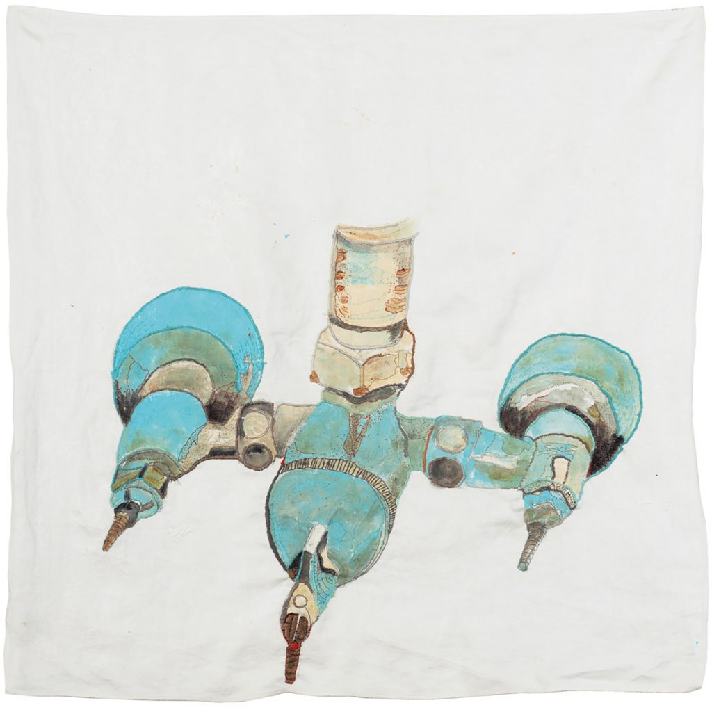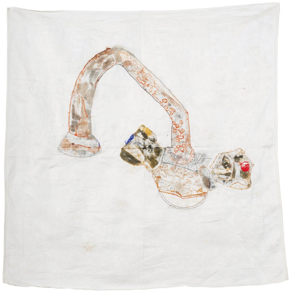 Insofern „fließen“ in eher grob gemalten, doch fein bestickten Herrentaschentüchern diese beiden – wenn verfügbar, unspektakulären – Errungenschaften der Zivilisation zusammen. So wie der Bodenauslauf der Dusche zum nichtssagenden Ornament wird, verselbständigen sich auch die Armaturen zu funktionslosen Requisiten.