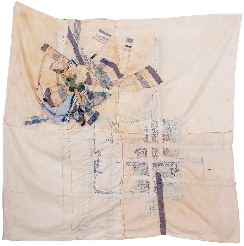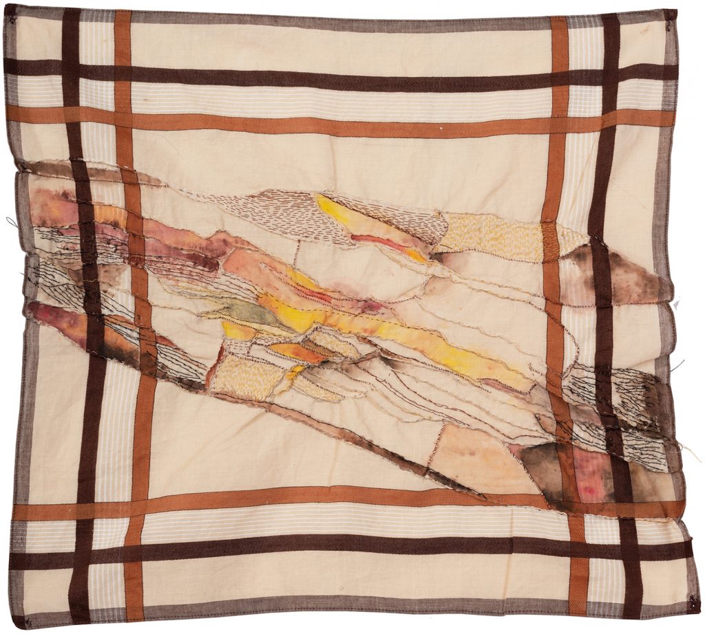 Ein sauberes, gebügeltes Taschentuch signalisierte (noch vor wenigen Jahrzehnten), dass die Ordnung des persönlichen Alltags gewahrt sei. Andererseits zeigte es an, für die Extremmomente einer Durchschnittsexistenz gewappnet zu sein: den Schweiß, als Ausscheidung einer Krankheit oder übermäßiger Anstrengung auffangen zu können, ebenso Tränen des Schmerzes oder der Freude. In „ Strudel und Abtransport“ verschlingen sich die blau gestreiften Stoffquadrate zu einem Chaos der Emotionen. Sie zeigen Kontrollverlust an und den erzwungenen Abschied vom zivil(isiert)en Dasein. In Streifen und Fetzen zerlegt, formieren die numehr unbrauchbaren Tüchlein ein traurig-rostiges „Sediment“ des Gewesenen. Doch immer wieder sind es gerade die sorgfältigen Eingriffe mit der Nähnadel, die die Hoffnung auf Heilung und Reparatur nahelegen.